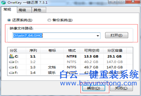 臺式電腦玩游戲很好用,很流暢。比筆記本用起來效果好多了,不過電腦好沒有好的系統來匹配,用起來也會慢,玩起游戲來也還是會卡的。系統有問題其實要解決也不麻煩,只需要重裝下系統就可以了。下面白云為大家介紹臺式機使用onekey重裝win7系統步驟。1、首先在白云系統大全下載一個win7系統到D盤根目錄,然后下載一個onekey ghost,并且打開onekey ghost。