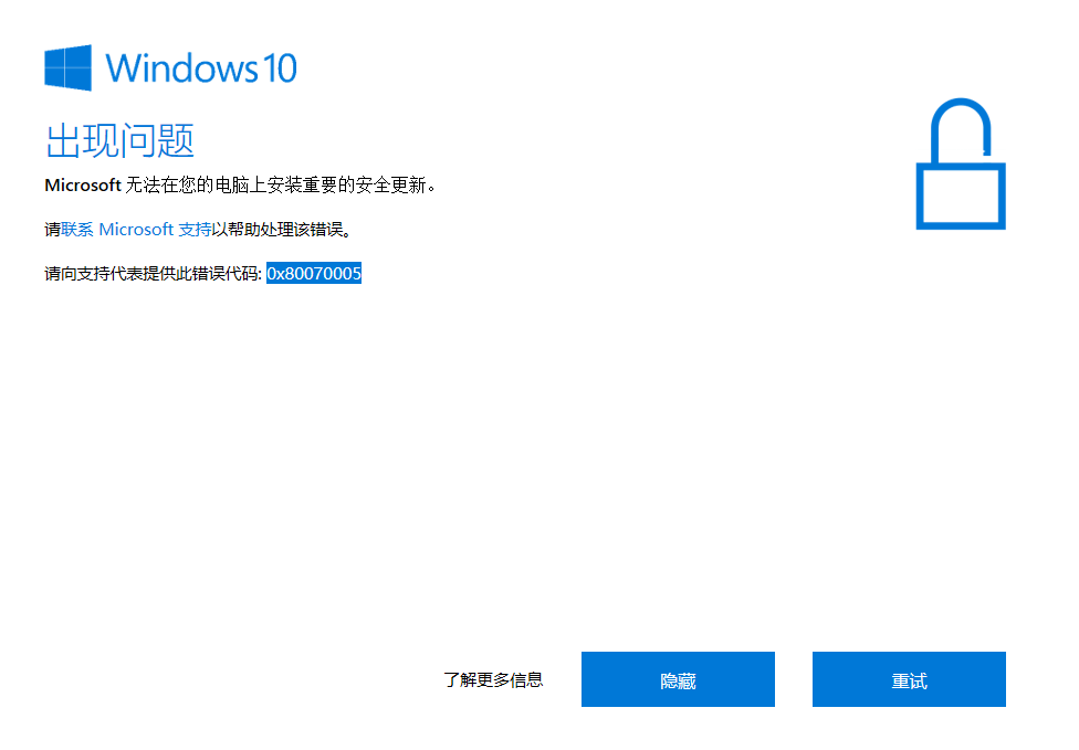 Windows10出現問題,Microsoft無法在您的電腦上安裝重要的安全更新。請聯系Microsoft支持以